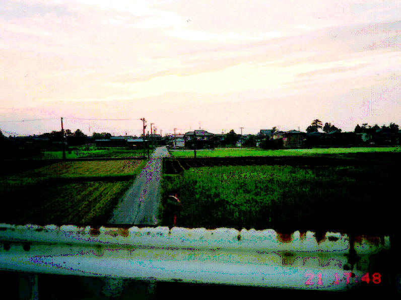 | 丸岡町の竹田川を渡る手前で、きれいな夕日に気づく。17:48。左方畑奥の家並みの上に日が沈んでいく。日没前の写真を撮る。これから金津町に入って、牛ノ谷峠を越えて熊坂交差点を目指す。行程表を作るとき、大した峠では無いと格別な考慮はしていない峠だ。ところが、いざ峠に差し掛かってみると大間違い。走行距離が200Kmを越えての向かい風。その上街灯もなく暗い。勾配も坂を感じるには十分。「こんなきつい坂の筈じゃなか ったのに」と一人ぶつぶつ。ヘッドライトは点けているが、あまり良く見えない。後ろから来る車のライトで、予め先のほうまで道路状況を見ておくがスピードは出せない。「熊坂検問所」の標識がある。到着18:16(予定19:34)。街灯の下で休憩を兼ねて、予防のための鎮痛ゲルを足に擦り込む。向こうのガソリンスタンドの店員がこちらを見ている。暗闇の中で休憩していれば、不審者に見えるんだろうなと思う。 |